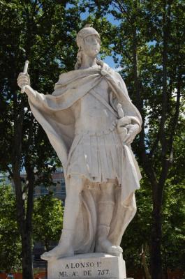 El grupo de estatuas de piedra blanca, QUE VEREMOS A CONTINUACIÓN, forma parte de una serie dedicada a todos los monarcas de España, mandadas hacer para la decoración del Palacio Real de Madrid durante el reinado de Fernando VI. Se ejecutaron entre 1750 y 1753. En un principio la idea era que adornasen la cornisa del palacio, pero nunca llegaron a su destino y se colocaron en distintos lugares de la ciudad, como la propia plaza de Oriente. Las veinte situadas en la plaza de Oriente corresponden a cinco reyes visigodos y a quince monarcas de los primeros reinos cristianos de la Reconquista. Tenemos foto de todas ellas. |